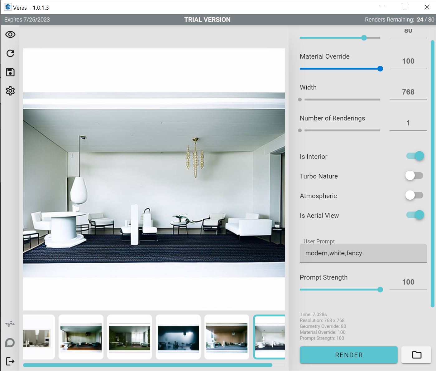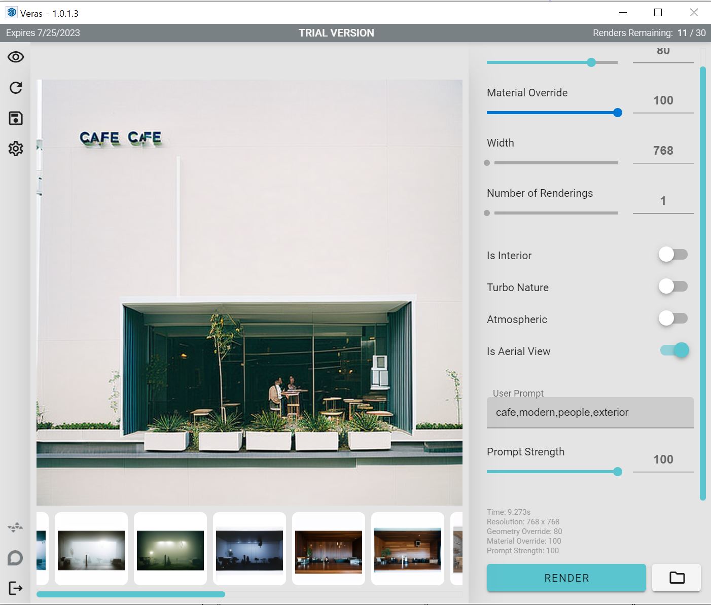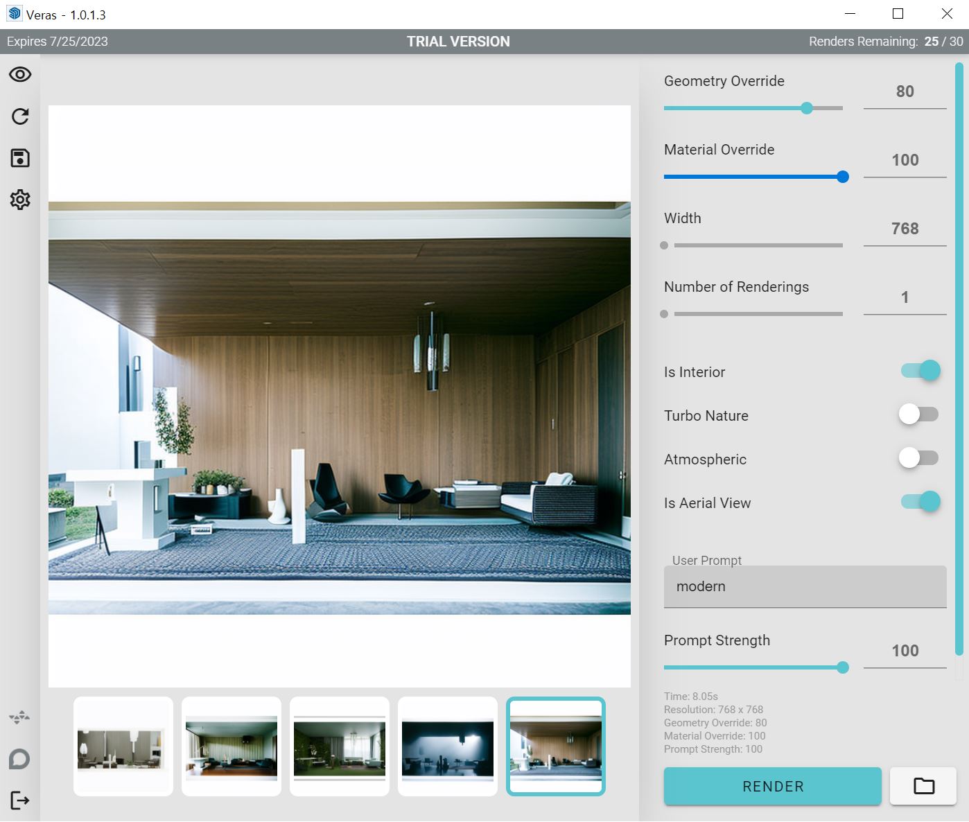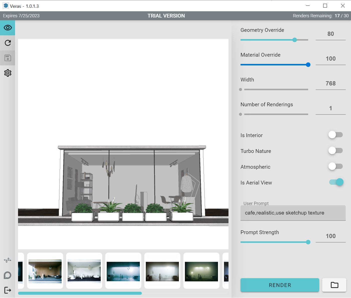 Veras는 내가 모델링한 골조를 변경하지 않는 대신 마감재,주변 환경,소품,시간대,분위기 를 다양하게 자동으로 적용하여 리터치한 이미지를 제공해주는 프로그램입니다.