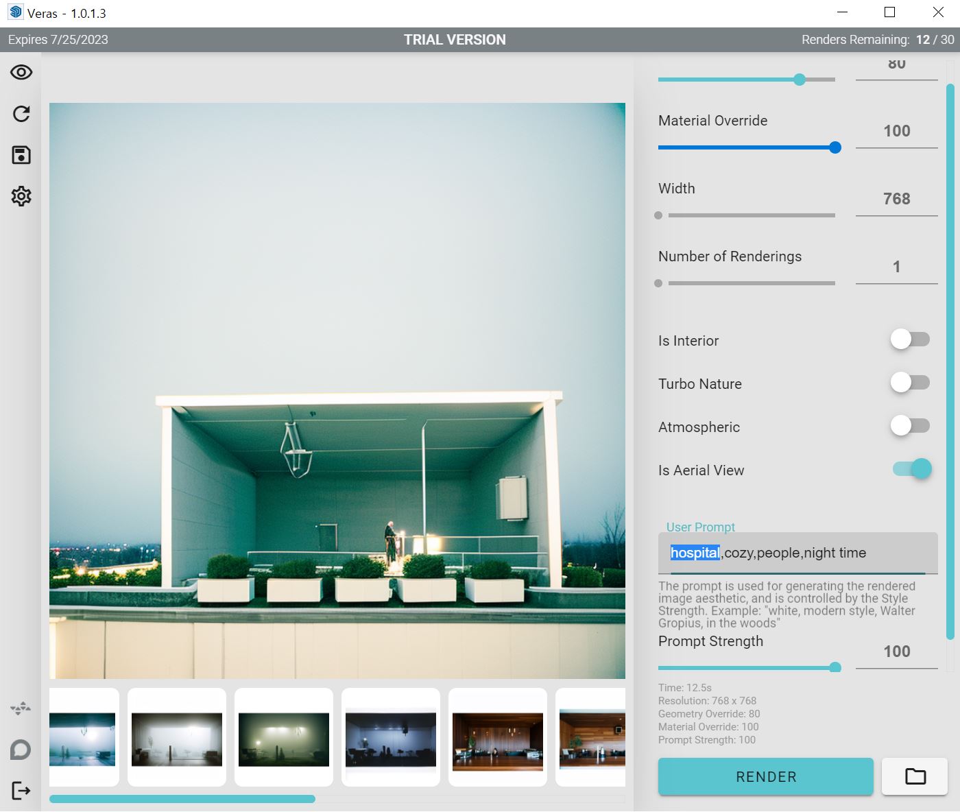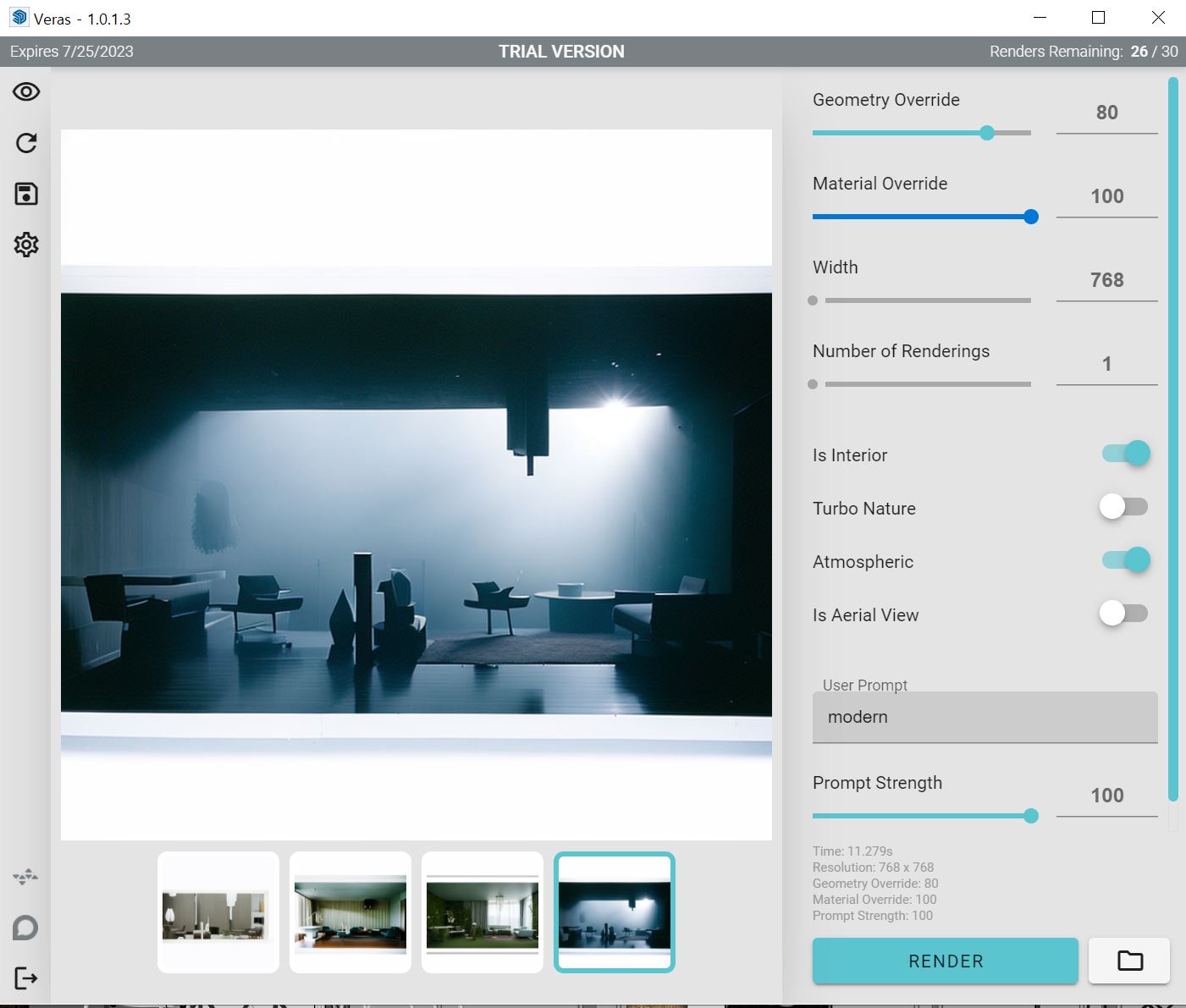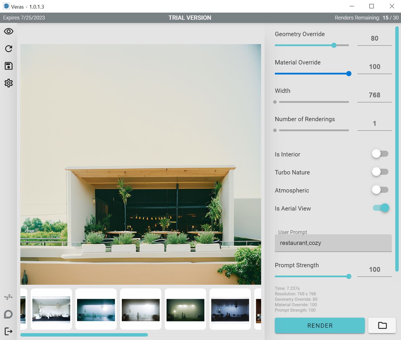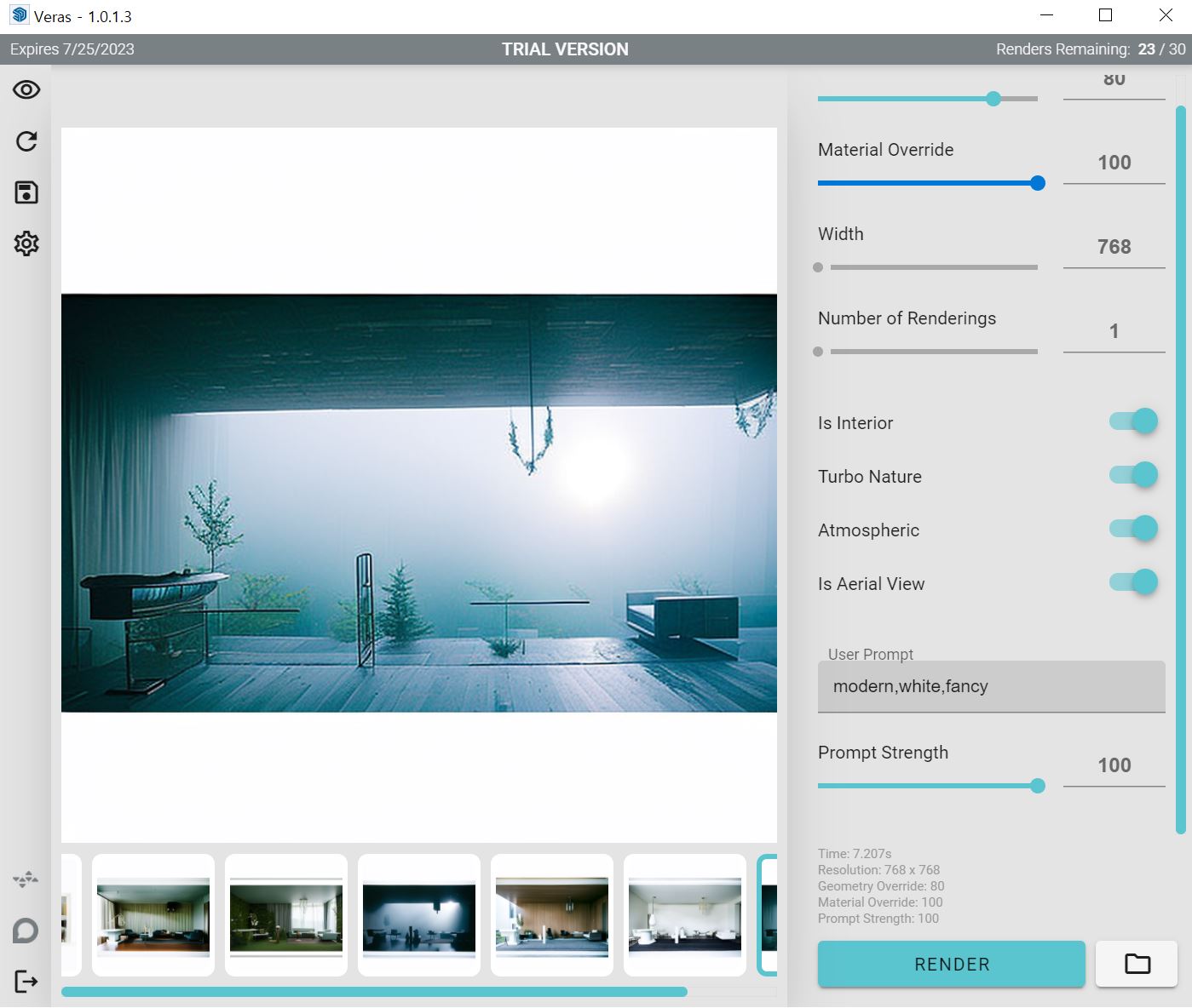 Veras는 내가 모델링한 골조를 변경하지 않는 대신 마감재,주변 환경,소품,시간대,분위기 를 다양하게 자동으로 적용하여 리터치한 이미지를 제공해주는 프로그램입니다.