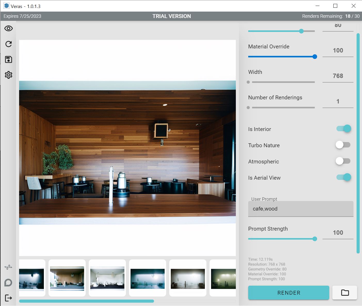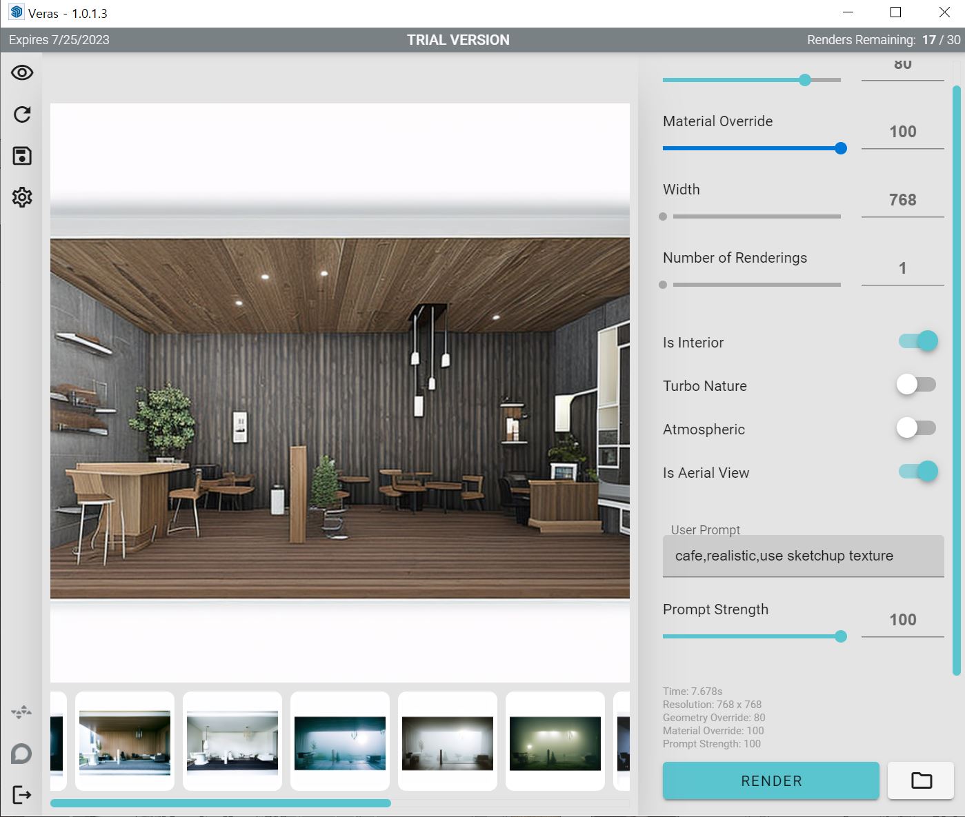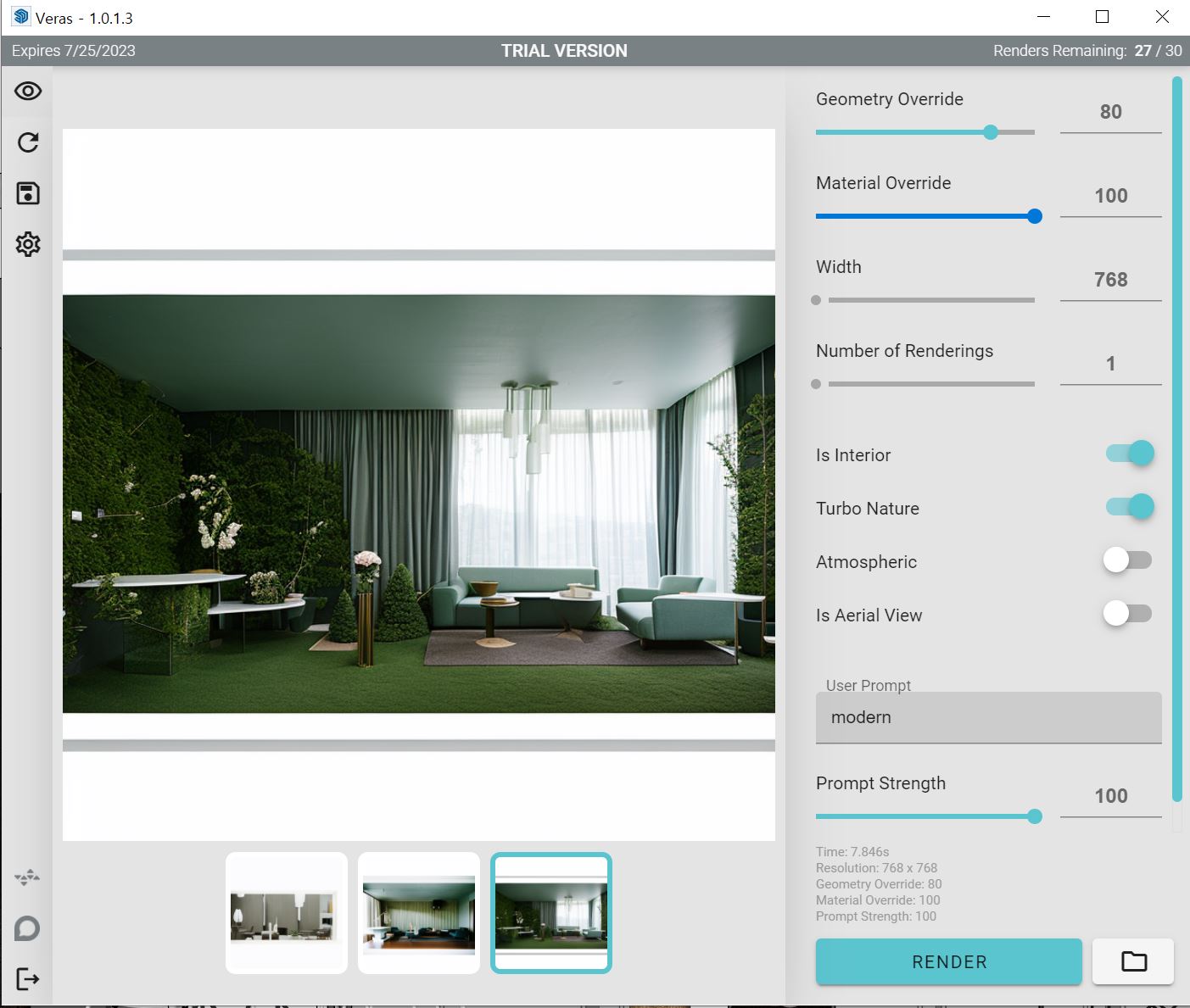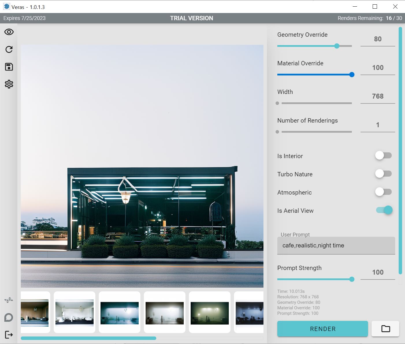 Veras는 내가 모델링한 골조를 변경하지 않는 대신 마감재,주변 환경,소품,시간대,분위기 를 다양하게 자동으로 적용하여 리터치한 이미지를 제공해주는 프로그램입니다.