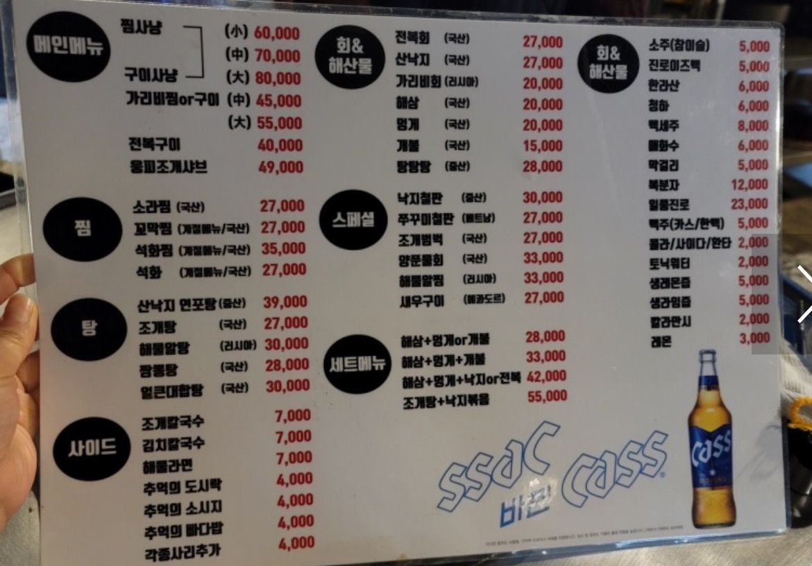 조개찜 소,중,대 각각 6만원,7만원,8만원